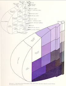 As if that wasn’t enough to earn a prominent spot in my bookcase, the authors dug through all the available color naming guides (like Maerz and Paul, Plochere, and Ridgway) to determine the Munsell coordinates for each of the color words that were defined. As a result, the NBS standard further provides two lists: 1) a list that goes from common color name to the appropriate Centroid Colors in Munsell space, and 2) a list that provides all the color names that have been associated with each of the 267 Centroid Colors.